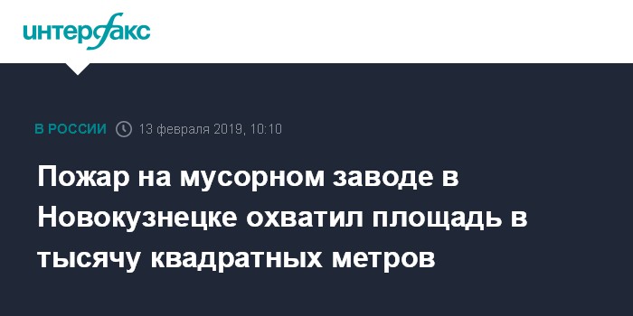 Москва. 13 февраля. INTERFAX.RU - Площадь пожара на мусоросортировочном заводе регионального оператора в Новокузнецке достигла тысячи квадратных метров, сообщили агентству "Интерфакс" в пресс-службе Главного управления МЧС по Кемеровской области в среду.