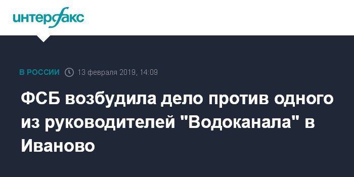 Москва. 13 февраля. INTERFAX.RU - Следственный отдел УФСБ России по Ивановской области возбудил уголовное дело о присвоении и растрате в отношении одного из руководителей АО "Водоканал", сообщает пресс-служба УФСБ по региону.