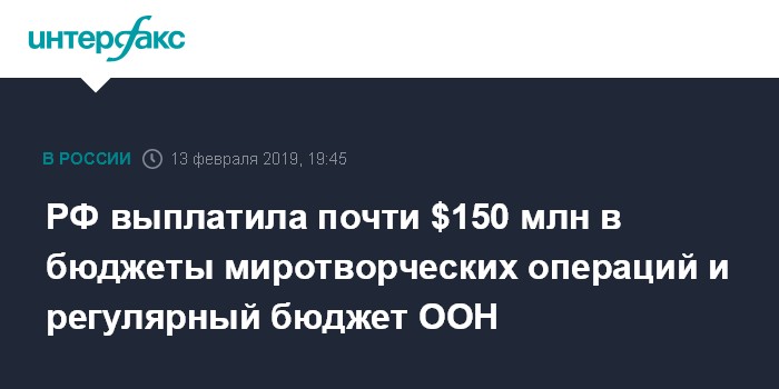 Москва. 13 февраля. INTERFAX.RU - Россия совершила перевод в регулярный бюджет ООН и в бюджеты миротворческих операций около $148,5 млн, сообщает сайт постпредства РФ при ООН.