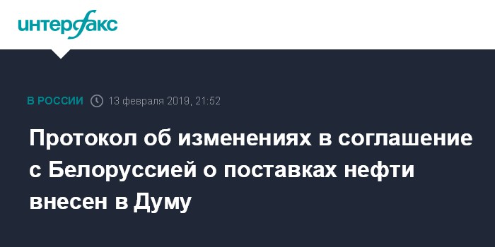 Москва. 13 февраля. INTERFAX.RU - Правительство РФ внесло на ратификацию в Госдуму протокол об изменениях в соглашение с Белоруссией по поставкам нефти и нефтепродуктов.