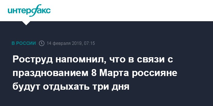 Москва. 14 февраля. INTERFAX.RU - В Федеральной службе по труду и занятости (Роструд) напомнили, что в связи с празднованием 8 марта Международного женского дня у россиян в этом году будет три выходных дня подряд.