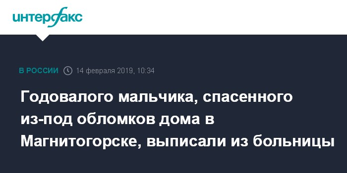 Москва. 14 февраля. INTERFAX.RU - Годовалого мальчика, пострадавшего при обрушении дома в Магнитогорске, в четверг выписали из НИИ неотложной детской хирургии и травматологии, сообщил заведующий отделением НИИ Павел Мединский.