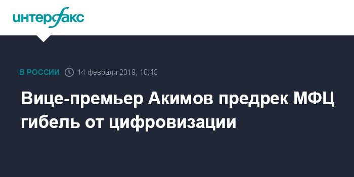 Москва. 14 февраля. INTERFAX.RU - Вице-премьер Максим Акимов рассчитывает, что реализация программы по цифровизации в России приведет к исчезновению многофункциональных центров (МФЦ), так как любые документы можно будет оформить дистанционно.