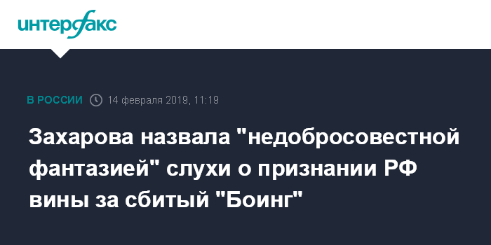 Москва. 14 февраля. INTERFAX.RU - Сообщения о том, что Россия готова обсуждать вопрос о компенсации и признании вины за крушение малайзийского "Боинга" - фейк, заявила в четверг официальный представитель МИД РФ Мария Захарова.