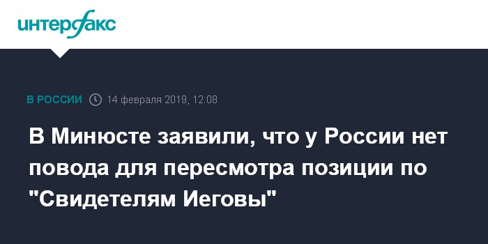 Москва. 14 февраля. INTERFAX.RU - Оснований для изменения позиции РФ о признании экстремистской организацией "Свидетелей Иеговы" пока нет, заявил заместитель главы Минюста РФ, уполномоченный РФ в Европейском суде по правам человека (ЕСПЧ) Михаил Гальперин.
