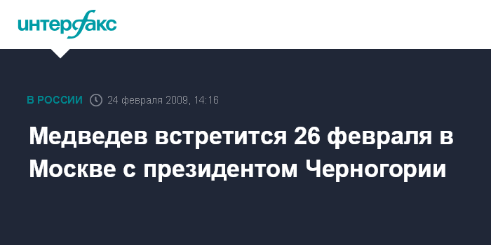 Москва. 24 февраля. INTERFAX.RU - Встреча президента России Дмитрия Медведева с президентом Черногории Филиппом Вуяновичем состоится 26 февраля в Москве.