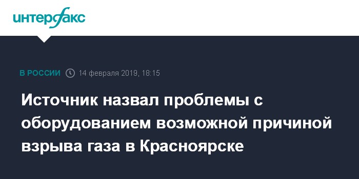Москва. 14 февраля. INTERFAX.RU - Нарушение техники безопасности и неисправность газового оборудования в одной из квартир могли спровоцировать хлопок газа в жилом доме в Красноярске, сообщил "Интерфаксу" источник в службе технического надзора региона.