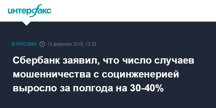 Москва. 15 февраля. INTERFAX.RU - Количество случаев мошенничества с использованием социальной инженерии (получение доступа к информации на основе особенностей психологии людей) в отношении клиентов Сбербанка выросло за последние полгода на 30-40%. Этот тренд продолжится, сообщил зампред правления Сбербанка Станислав Кузнецов, выступая на Российском инвестиционном форуме в Сочи.