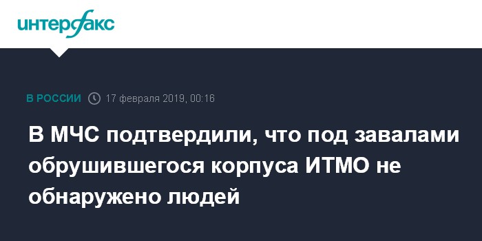 Москва. 17 февраля. INTERFAX.RU - Сотрудники МЧС при разборе завалов обрушившегося корпуса вуза в Петербурге на данный момент не обнаружили людей, основная версия случившегося - ошибка при ремонте.