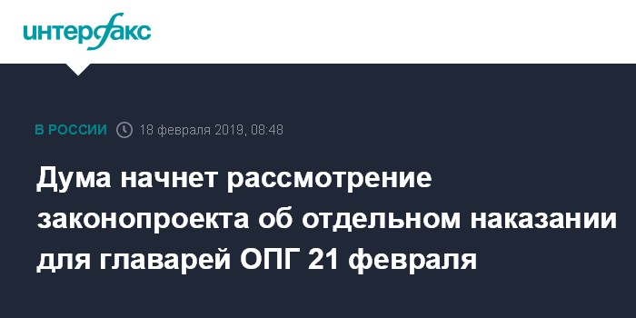 Ранее председатель профильного комитета по госстроительсву и законодательству Павел Крашенинников сообщил "Интерфаксу", что Госдума планирует завершить рассмотрение законопроекта во всех трех чтениях в марте. По его словам, законопроект не требует длительных рассылок, поскольку относится к исключительному ведению федерального центра.
