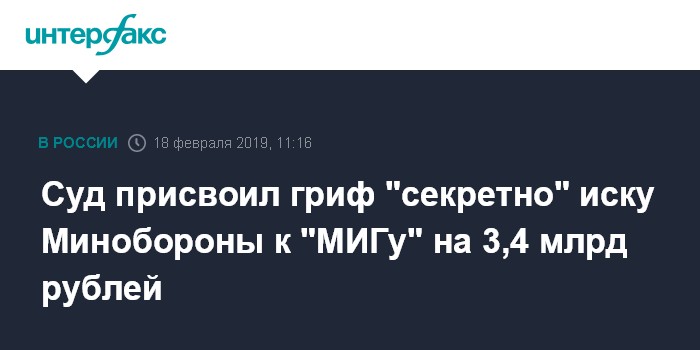 Москва. 18 февраля. INTERFAX.RU - Арбитражный суд Москвы 14 февраля присвоил гриф "секретно" делу по заявлению Минобороны РФ о взыскании с АО "Российская самолетостроительная корпорация" "МиГ" 3,4 млрд рублей.