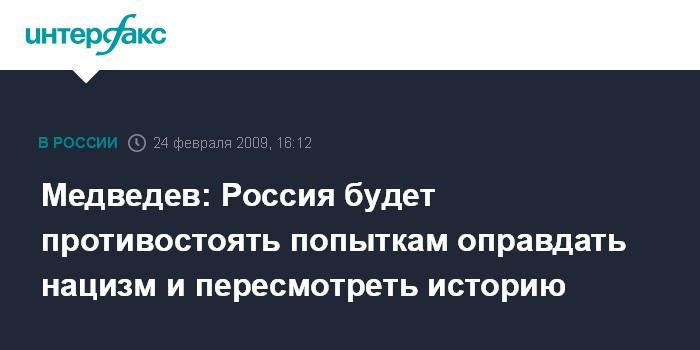 Москва. 24 февраля. INTERFAX.RU - Президент РФ Дмитрий Медведев считает недопустимыми попытки оправдать нацизм, и заявляет, что Россия будет противостоять этому.