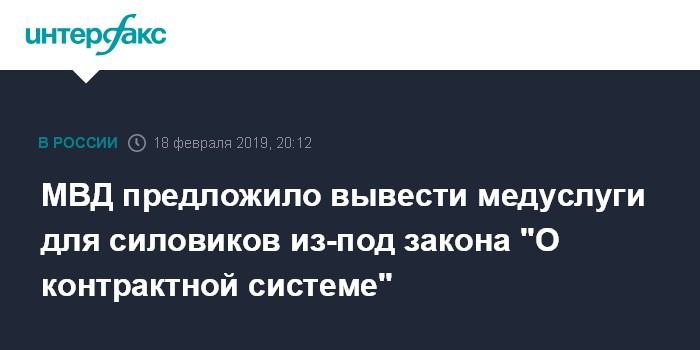 Москва. 18 февраля. INTERFAX.RU - МВД РФ предлагает вывести медицинские услуги для военнослужащих, сотрудников правоохранительных органов и приравненных к ним лиц из-под действия закона "О контрактной системе" (44-ФЗ). Это следует из поправок к 44-ФЗ, опубликованных на портале проектов нормативных правовых актов.