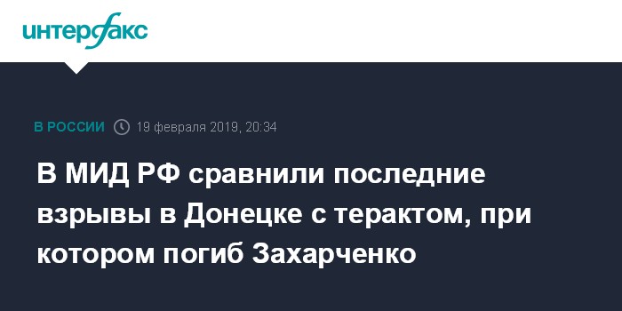 Москва. 19 февраля. INTERFAX.RU - В МИД РФ отмечают схожесть прогремевших накануне в Донецке взрывов с терактом, в котором погиб глава самопровозглашенной Донецкой народной республики Александр Захарченко.