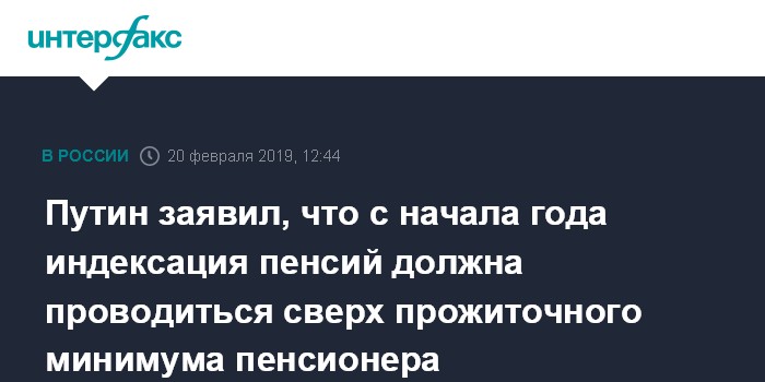 Москва. 20 февраля. INTERFAX.RU - С 2019 года индексация пенсий и ежемесячных денежных выплат должна осуществляться сверх уровня прожиточного минимума пенсионеров, заявил президент РФ Владимир Путин, выступая с посланием Федеральному Собранию в среду.