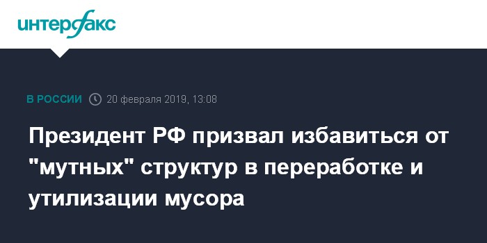 Москва. 20 февраля. INTERFAX.RU - Президент Владимир Путин потребовал навести порядок и избавиться от "мутных" структур в сфере переработки и утилизации мусора.