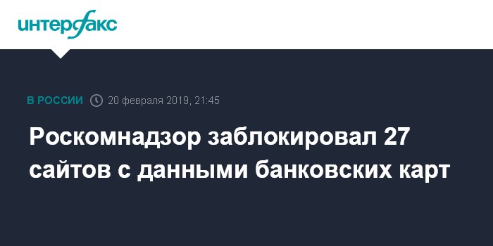 Москва. 20 февраля. INTERFAX.RU - Роскомнадзор заблокировал 27 сайтов, на которых была размещена информация о продаже данных банковских карт, а также о способах изготовления устройств для списания денежных средств, сообщили на сайте ведомства.
