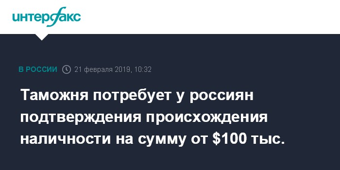 Москва. 21 февраля. INTERFAX.RU - Таможенные органы стран-членов Евразийского экономического союза (ЕАЭС) могут начать требовать у граждан подтверждения происхождения ввозимой или вывозимой наличности в случае, если сумма превышает $100 тыс.