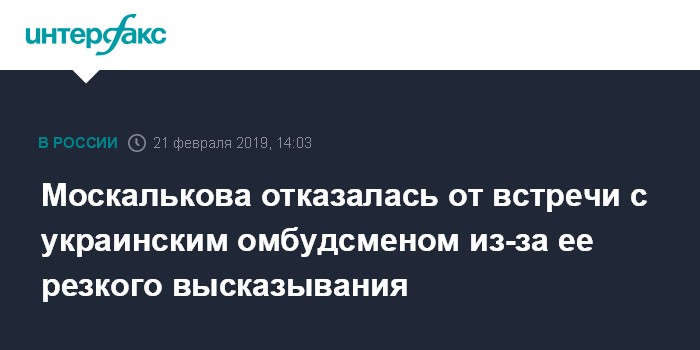 Москва. 21 февраля. INTERFAX.RU - Официальная встреча уполномоченных по правам человека России и Украины отменена из-за резких заявлений украинского омбудсмена Людмилы Денисовой, сообщает пресс-служба уполномоченного по правам человека в РФ Татьяны Москальковой.