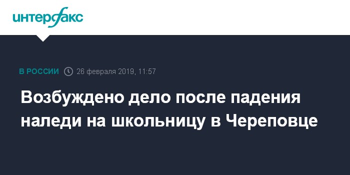 Москва. 26 февраля. INTERFAX.RU - В Вологодской области возбудили уголовное дело по факту падения снежно-ледяных масс на школьницу в Череповце, сообщает пресс-служба регионального СКР во вторник.