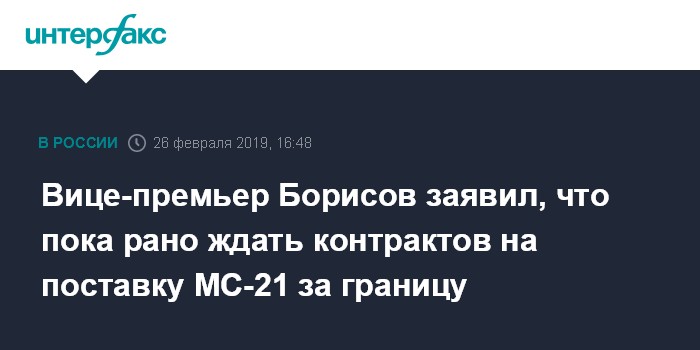 Вице-премьер Борисов заявил, что пока рано ждать контрактов на поставку МС-21 за границу