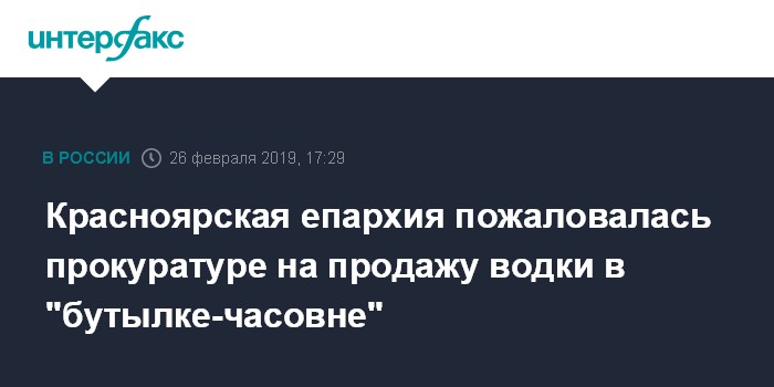 Москва. 26 февраля. INTERFAX.RU - Красноярская епархия направила обращение в прокуратуру для правовой оценки продажи в местных магазинах бутылки водки в виде православной часовни. Об этом сообщил агентству "Интерфакс" официальный представитель епархии Андрей Скворцов.