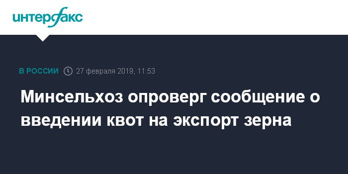 Москва. 27 февраля. INTERFAX.RU - Минсельхоз России опровергает сообщение о введении квот на экспорт зерна.