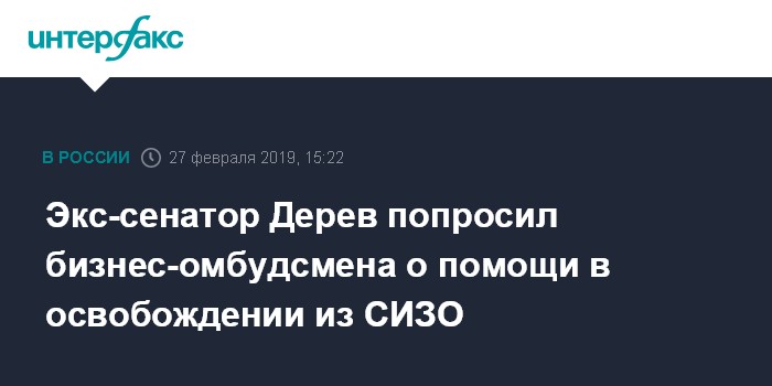 Экс-сенатор Дерев попросил бизнес-омбудсмена о помощи в освобождении из СИЗО