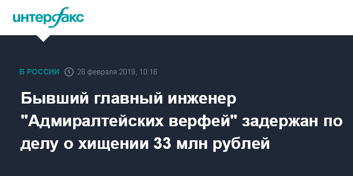 Бывший главный инженер "Адмиралтейских верфей" задержан по делу о хищении 33 млн рублей