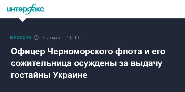 Москва. 28 февраля. INTERFAX.RU - Майор Черноморского флота и его сожительница, признавшие вину в выдаче гостайны Украине, приговорены к 10 и 9 годам лишения свободы соответственно, сообщили "Интерфаксу" в четверг в Центре общественных связей (ЦОС) ФСБ РФ.