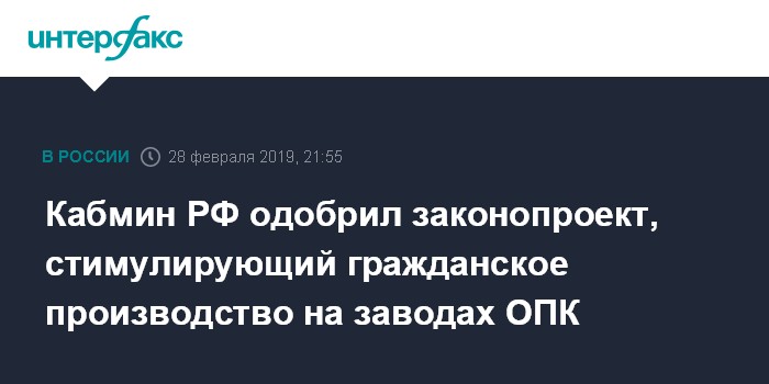 Москва. 28 февраля. INTERFAX.RU - Правительство РФ на заседании в четверг одобрило проект федерального закона, цель которого - интенсифицировать производство продукции гражданского назначения на предприятиях оборонно-промышленного комплекса (ОПК), сообщается на сайте правительства.