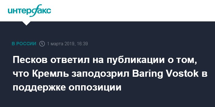 Москва. 1 марта. INTERFAX.RU - Пресс-секретарь президента Дмитрий Песков не слышал о публикациях, согласно которым Кремль якобы подозревает инвестфонд Baring Vostok в оказании финансовой поддержки оппозиции.