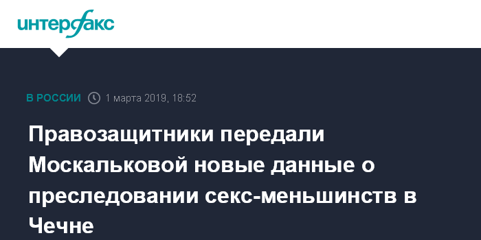 Москва. 1 марта. INTERFAX.RU - Представители правозащитной организации "ЛГБТ-сеть" и "Новой газеты" передали уполномоченному по правам человека в РФ Татьяне Москальковой информацию о новых фактах преследования сексуальных меньшинств в Чечне, сообщил директор программ "ЛГБТ-сети" Игорь Кочетков.