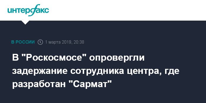 В "Роскосмосе" опровергли задержание сотрудника центра, где разработан "Сармат"