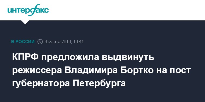 Москва. 4 марта. INTERFAX.RU - Санкт-Петербургское городское отделение КПРФ приняло решение предложить кандидатуру депутата Государственной думы Владимира Бортко к выдвижению на пост губернатора северной столицы, сообщила пресс-служба партии.
