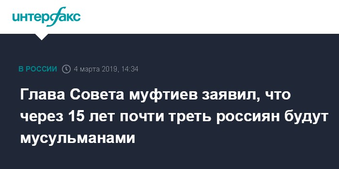 Москва. 4 марта. INTERFAX.RU - Председатель Совета муфтиев России Равиль Гайнутдин заявил о существенном увеличении доли исламского населения в стране в обозримой перспективе.