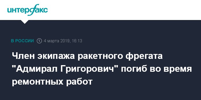 Москва. 4 марта. INTERFAX.RU - Военнослужащий ракетного фрегата "Адмирал Григорович" Черноморского флота погиб во время проведения ремонтных работ, сообщил "Интерфаксу" информированный источник.