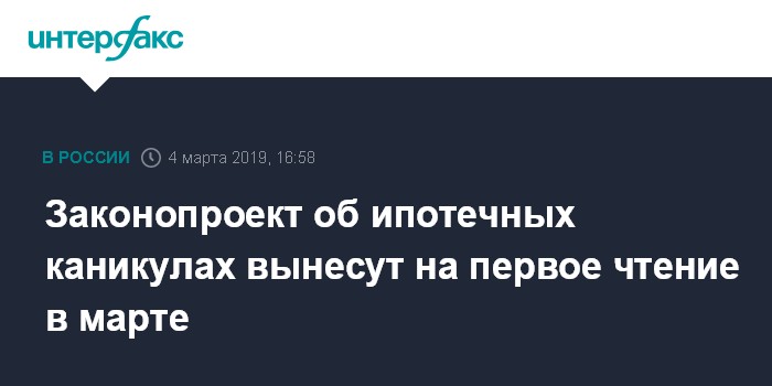 Москва. 4 марта. INTERFAX.RU - Госдума до конца марта может рассмотреть в первом чтении законопроект об ипотечных каникулах, сказал журналистам первый вице-спикер Госдумы Александр Жуков.