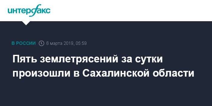 Москва. 6 марта. INTERFAX.RU - Сейсмологи за сутки зарегистрировали пять землетрясений, произошедших на территории Сахалинской области, сообщили агентству "Интерфакс - Дальний Восток" в среду в сахалинском филиале Единой Геофизической службы РАН.