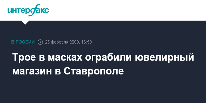 Ставрополь. 25 февраля. INTERFAX.RU - В центре Ставрополя около 13:30 мск среды трое неизвестных в масках ворвались в помещение ювелирного магазина по ул. Пушкина 30.
