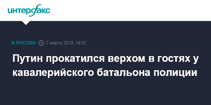 Москва. 7 марта. INTERFAX.RU - Президент РФ Владимир Путин в четверг продемонстрировал навыки верховой езды; прокатиться на гнедом скакуне ему предложили сотрудники кавалерийского батальона, входящего в состав 1-го Оперативного полка ГУВД Москвы.