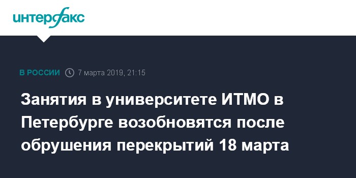 Москва. 7 марта. INTERFAX.RU - Занятия в корпусах петербургского Университета информационных технологий, механики и оптики (ИТМО), где в феврале произошло обрушение, начнутся 18 марта, сообщается в четверг на сайте вуза.