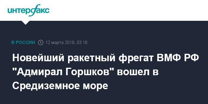 Москва. 12 марта. INTERFAX.RU - Отряд кораблей Северного флота во главе с новейшим ракетным фрегатом "Адмирал Горшков" во вторник рано утром по московскому времени, пройдя пролив Гибралтар, вошел в акваторию Средиземного моря, следует из мониторинговых данных передвижения морских судов международной системы AIS.