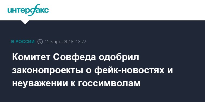 Москва. 12 марта. INTERFAX.RU - Комитет Совета Федерации по конституционному законодательству и госстроительству рекомендовал палате одобрить проекты законов о наказаниях за "фейковые" новости и неуважение к госсимволам.