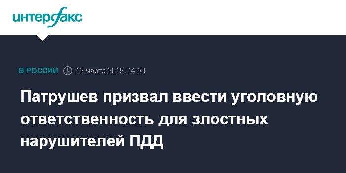 "Систематические и грубые нарушения правил дорожного движения, сопряженные с возможными негативными последствиями для здоровья, жизни граждан и их имущества, управление транспортными средствами лицами, лишенными таких прав - должно жестко пресекаться сотрудниками ГИБДД и серьезно наказываться, вплоть до введения уголовной ответственности", - заявил Патрушев на выездном совещании во вторник.