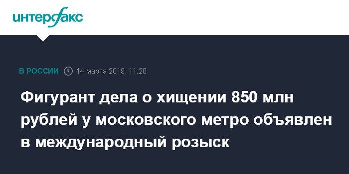 Москва. 14 марта. INTERFAX.RU - Один из фигурантов дела о хищении 850 млн рублей у московского метрополитена объявлен в международный розыск, сообщили в Следственном комитете России в четверг.