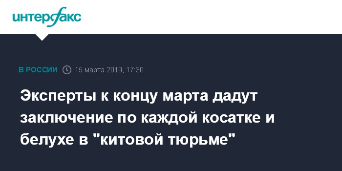 "Для проведения исследований животных 18-19 марта группа из ученых, ветеринаров, сотрудников специализированных учреждений, имеющих практический опыт работы с морскими животными, вылетает на место для проведения диагностики состояния здоровья косаток и белух. Состоится забор крови, осмотр и наблюдение. В десятидневный срок будут даны заключения по каждой косатке. До конца месяца проведут аналогичную работу с белухами", - отмечается в сообщении пресс-службы министерства, поступившем в пятницу в "Интерфакс".