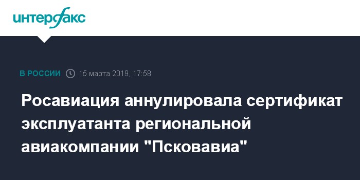 Москва. 15 марта. INTERFAX.RU - Росавиация аннулировала сертификат эксплуатанта региональной авиакомпании "Псковавиа", свидетельствует приказ ведомства от 12 марта, с копией которого ознакомился "Интерфакс".