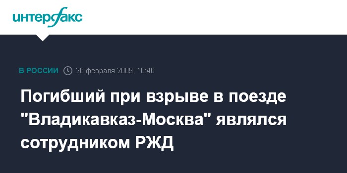 Москва. 26 февраля. INTERFAX.RU - Погибший при взрыве в вагоне-ресторане скорого пассажирского поезда "Владикавказ-Москва" является сотрудником Федеральной пассажирской дирекции ОАО "Российские железные дороги" (РЖД), сообщил департамент корпоративных коммуникаций РЖД. "Среди пассажиров пострадавших нет", - отмечает компания.