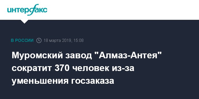 Москва. 18 марта. INTERFAX.RU - Около 370 работников АО "Муромский завод радиоизмерительных приборов" (входит в АО "Концерн воздушно-космической обороны "Алмаз-Антей") планируется сократить в апреле, сообщает корпоративное издание "Маяк".